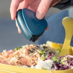 La Spice Box Light My Fire ou Salt & Pepper Plus passe dans une petite poche de veste ou de sac à dos. La Spice Box peut tomber à l’eau : elle ne coule pas et ne prend pas l’eau. Du fait de sa couleur propre, la Spice Box Light My Fire se reconnait facilement. La Spice Box Light My Fire respecte votre santé : elle est dépourvue de Bisphénol A et dépourvue de toute toxine. Matériaux de fabrication : corps ABS et joints étanches en caoutchouc TPE. Elle est facile à remplir, facile à transporter et facile à utiliser. Elle n’est pas encombrante et sait se faire discrète dans votre sac à dos (dimensions : 70 x 31 mm). Coloris dominant : bleu.