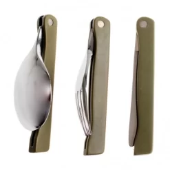 11,5 cm de longueur de manche et 20 cm de longueur totale, la taille de ce couvert pliable est parfaitement adaptée au monde du trekking et du voyage. Il en est de même pour le poids de ce produit : 220 grammes en comptant la housse. Le coloris vert kaki ou vert armée (selon les appellations) se fond dans la nature. Toute la partie métallique aussi bien de la cuillère pliable, de la fourchette pliable ou du couteau pliable sont en acier inoxydable : matériau sain pour la santé, durable et anticorrosion. Les manches sont en plastique de type ABS (léger et solide). Remarque intéressante : pour un rangement compact et un gain de place maximal, rangez l’ensemble à l’intérieur de votre popote de camping (par exemple).